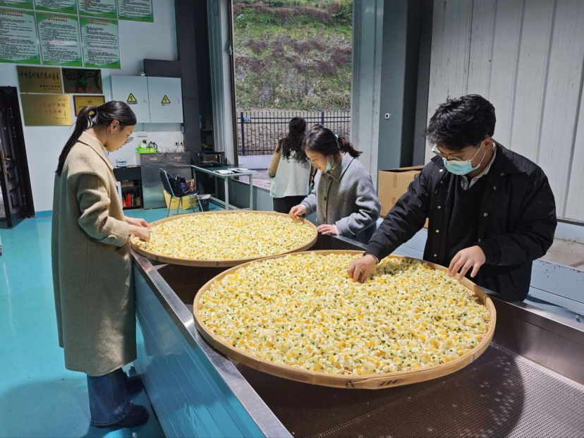调研期间,一行深入企业生产车间,通过实地察看、现场交流与审评品鉴,针对未被充分利用的茶树花资源,从茶花采摘、杀青、干燥到成品贮藏全过程进行了细致的技术诊断,为企业开发具有蜜香风味的创新型茶树花茶产品提供了新思路,助力产品多元化开发。