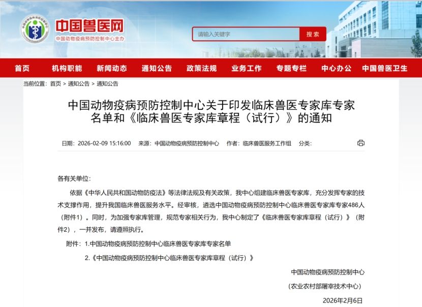 2026年2月6日,中国动物疫病预防控制中心发布了《关于印发临床兽医专家库专家名单和<临床兽医专家库章程(试行)>的通知》。经审核,在全国范围内共遴选临床兽医专家库专家486人,其中包括临床技术规范组、临床技术研究组、伴侣动物临床技术组与临床技术推广组。我院教师赵鸿远博士入选临床技术规范组——生猪专家组专家,本组共56人,其中陕西区域共2人。