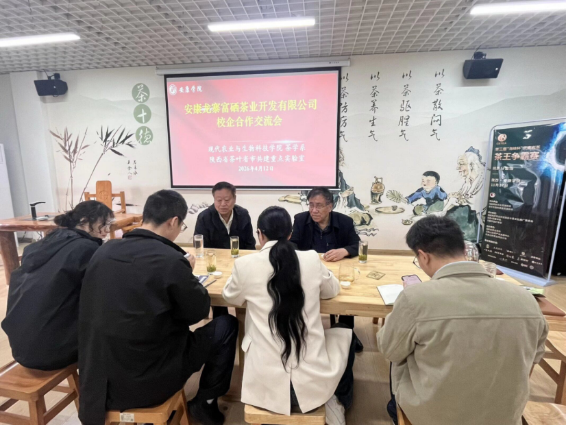4月12日,安康龙寨富硒茶业开发有限公司一行莅临我校参观交流,并就校企项目合作进行深入洽谈。茶学系教师李冬花、齐玉岗、吴冲、尹旭超、常娜接待了来访企业。